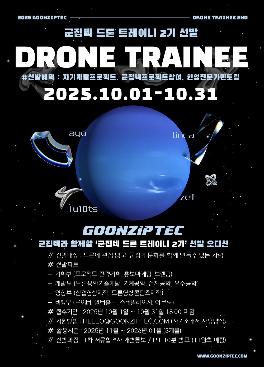 선발대상 : 드론에 관심 많고, 군집텍 문화를 함께 만들수 있는 사람